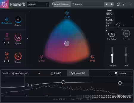Use the Pre EQ with an Auto Cut function to automatically clean your input signal so it sounds its best before adding reverb. A Reverb EQ with a built-in Masking Meter, along with automatic Unmasking of the input signal, help keep your reverb under control in the mix.