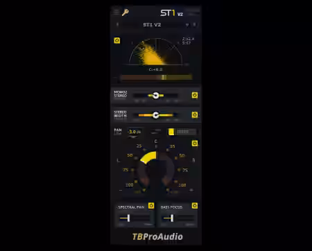 ST1 is a simple tool that lets you control the width and the panorama of a stereo audio signal. It includes a mono-to-stereo function, a stereo field enhancer, a rich panning knob that includes spectral panning, and a bass-focus feature. The phase and correlation meter visually monitors the panning position and stereo width.