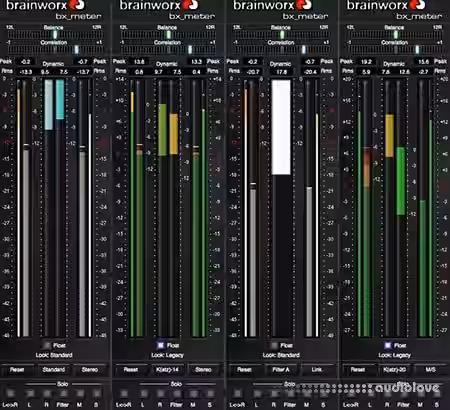bx_meter will show you Peak and RMS values of your mixes, and in addition to that it will show you the relation between both with the centered DYNAMIC LEDs. bx_meter has a Mid / Side mode (Sum and Difference) in addition to the standard L/R mode, and it offers 3 different weightings to be used to display the dynamics more like you hear them. Just like all the other Brainworx tools you will find several solo switches and nice extra features like the floating dynamic LED mode.